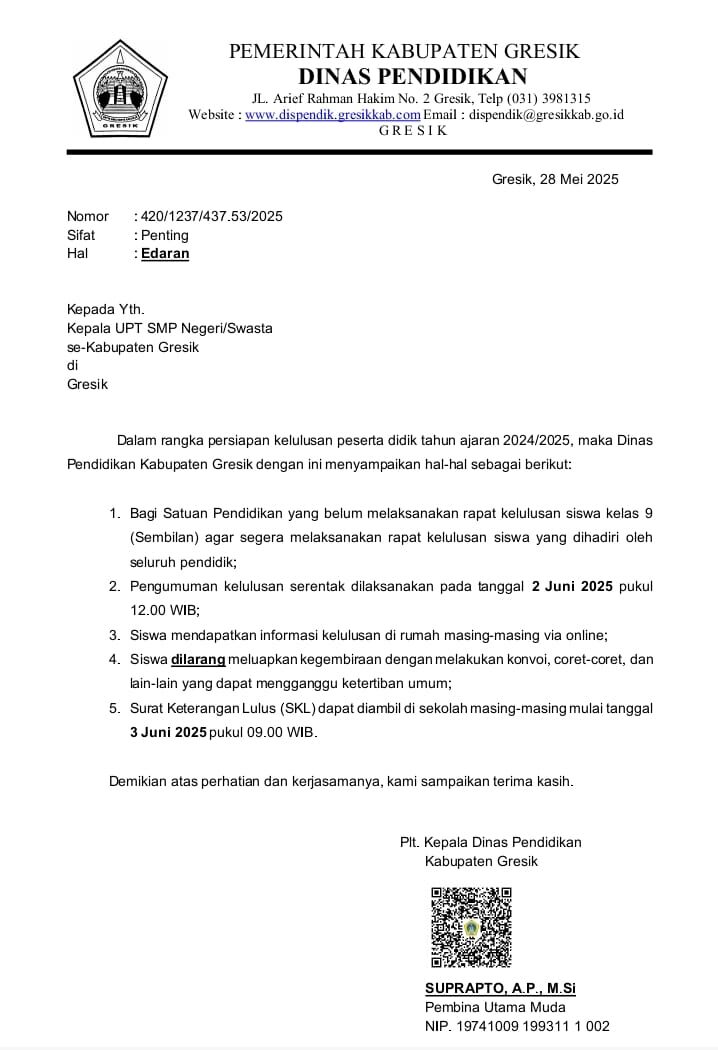 Puji syukur ke hadirat Allah SWT, Tuhan Yang Maha Esa, karena atas rahmat dan karunia-Nya, kita dapat menyampaikan hasil kelulusan siswa kelas IX SMP Muhammadiyah 2 Balongpanggang tahun ajaran 2024/2025. Sesuai Surat Edaran diatas dari Dinas Pendidikan Kabupaten Gresik Nomor: 420/1237/437.53/2025. Pengumuman kelulusan ini akan disampaikan pada hari Senin, 2 Juni 2025 pukul 12.00 WIB. Untuk Pengumuman Kelulusan Kelas IX SMP Muhammadiyah 2 Balongpanggang melalui website resmi sekolah di https://spemdaba.my.id. Untuk mengakses pengumuman tersebut, siswa hanya perlu menyiapkan NIS (4 digit) masing-masing yang dapat dilihat pada kartu ASP 2025.
