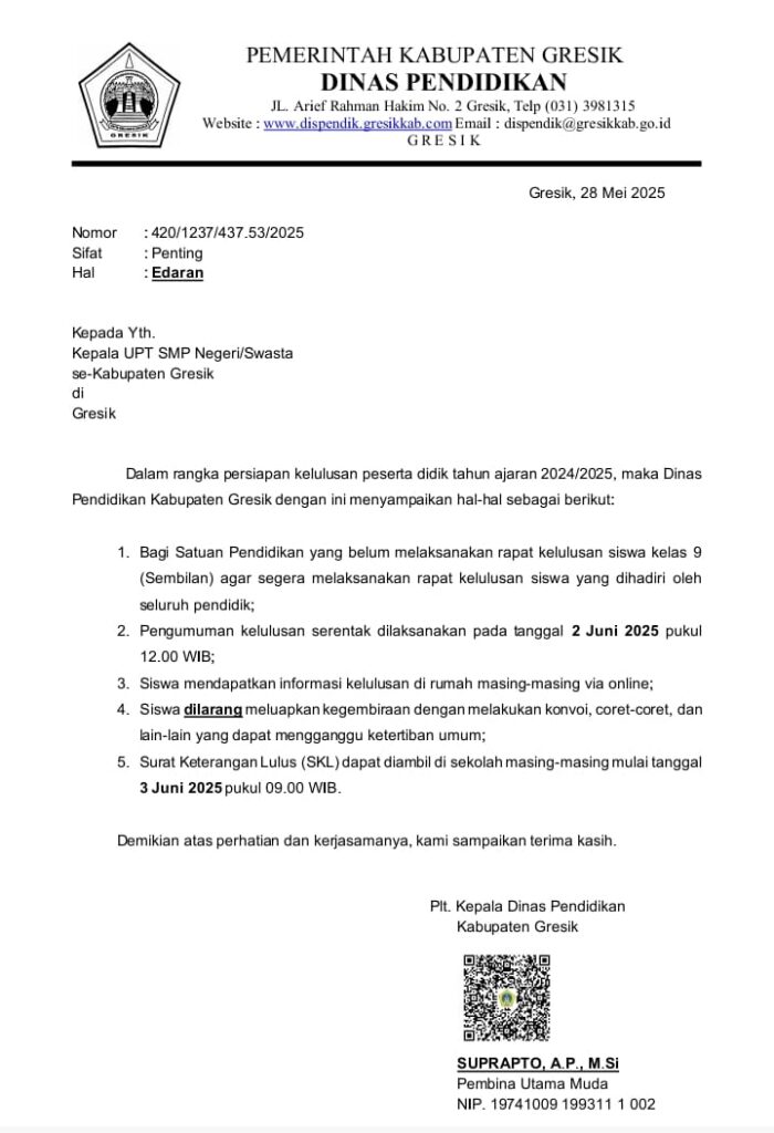 Puji syukur ke hadirat Allah SWT, Tuhan Yang Maha Esa, karena atas rahmat dan karunia-Nya, kita dapat menyampaikan hasil kelulusan siswa kelas IX SMP Muhammadiyah 2 Balongpanggang tahun ajaran 2024/2025. Sesuai Surat Edaran diatas dari Dinas Pendidikan Kabupaten Gresik Nomor: 420/1237/437.53/2025. Pengumuman kelulusan ini akan disampaikan pada hari Senin, 2 Juni 2025 pukul 12.00 WIB. Untuk Pengumuman Kelulusan Kelas IX SMP Muhammadiyah 2 Balongpanggang melalui website resmi sekolah di https://spemdaba.my.id. Untuk mengakses pengumuman tersebut, siswa hanya perlu menyiapkan NIS (4 digit) masing-masing yang dapat dilihat pada kartu ASP 2025.